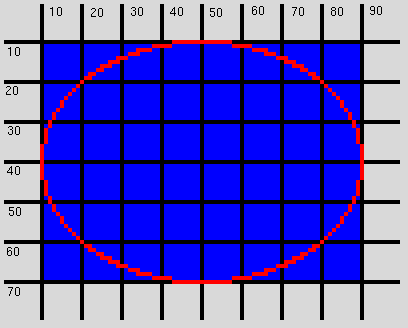 The red oval is exactly covered by the blue rectangle. We call the blue rectangle the bounding rectangle or bounding box for the oval, because this rectangle just exactly covers the oval. If the box were any smaller, part of the oval would be on the outside, and if it were any larger, you'd be able to see part of the box around the outside edge of the oval.