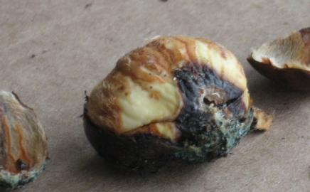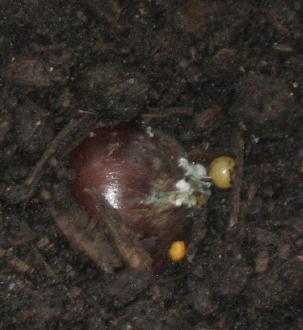 There's been no sign of sprouts above the ground yet, but I noticed a small amount of a white fungus on one of the exposed seeds this morning.