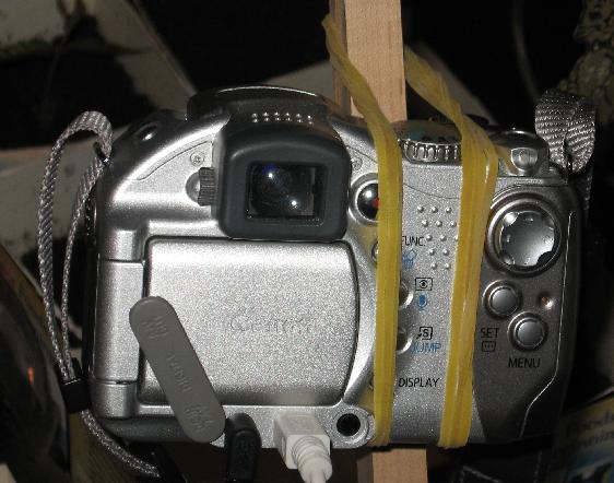 Depending on the release of the gphoto libraries you use, there may be better support of the camera features, including the ability to zoom via remote control. The release I had on this laptop was older with reduced (but adequate) functionality. The downside to the Canon S1IS is that it goes through batteries like a 10 year old goes through bubble-gum. A fresh set of alkaline batteries will last about a day. The careful design of my precision positioning system doesn't deal well with dismantling the camera to replace batteries, so it was necessary to find a power supply for the camera. Fortunately, my local camera store (Huron Camera, Dexter, MI) had the power adapter in stock. |