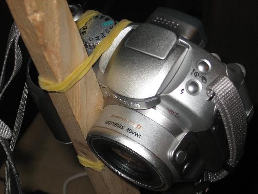 | I raided my woodshop for a reasonable sized piece of scrap and found some maple about 1/2 inch x 3/4 inch. The 1/2 inch width fits comfortable between the lens and the battery pack protrusion. The wood was clamped in a Jorgenson wood clamp (available at any hardware store) and rotated to a reasonable angle. |