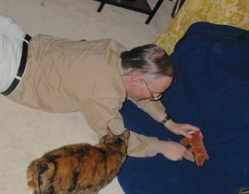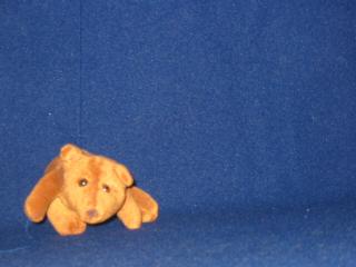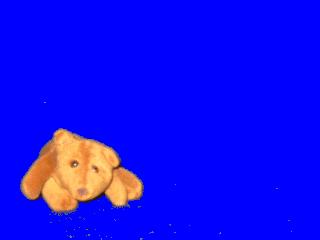 | As you can see, the blanket does not provide a perfectly uniform shade of blue. The Screenblast package will chromakey on a range of colors, but this can be ugly if there are any sets of similar colors in the real image. I had trouble finding a range of colors that would remove the entire blanket without making parts of the bear also transparent. I didn't want this movie to be The Ghost and Mrs Bruin. |