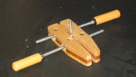 | The 2" 1/4x20 bolt was clamped in the Jorgenson clamp, and the bolt was screwed into the Canon Powershot A40. This is the custom tripod. (OK,it's not actually Jorgenson brand clamp, it's one I made from a kit and some maple and cherry scraps a few years ago.) |