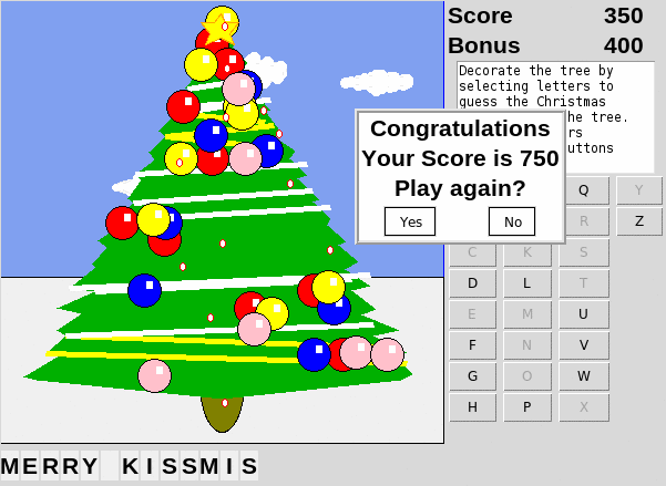 This game is hangman in reverse. Whenever you guess a letter that's in the phrase, you decorate the tree and get more points. If you guess a letter that's not in the phrase, you lose points. The goal is to score points and guess the phrase. The Christmas Tree always gets decorated.