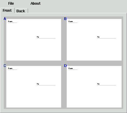 On windows, you can double click it to run. On X-Windows, you can run it from a command line, or double click, depending on your window manager settings. Once the application is running, you'll see a display similar to the image at the top of this page. Select whether you want a single sided postcard (perhaps to put a picture on the other side), or double sided postcard (because you have more to say.) The image at the top of this page shows the application for double sided postcards. Click the From, To and Message labels to open an edit window. Within that window, you can type the addresses or text for the recipient. You can also load or save a text file that you may have created or edited with another editor.. When you've finished composing your postcards, you can save the information using the File menu. The postcards can be saved in a format to be reloaded by the postcard program, or as Postscript or PDF files for printing, or further modification within another application. |